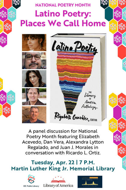 For National Poetry Month, read at DC’s Martin Luther King, Jr. Library in discussion with Elizabeth Acevedo, Francisco Aragon, Juan Morales, and Alexandra Lytton Regalado for a special poetry reading and celebration of the new publication Latino Poetry: The Library of America Anthology (LOA #382). In conversation with Georgetown University’s Ricardo Ortiz. My thanks to the DC Public Library and Letras Latinas.