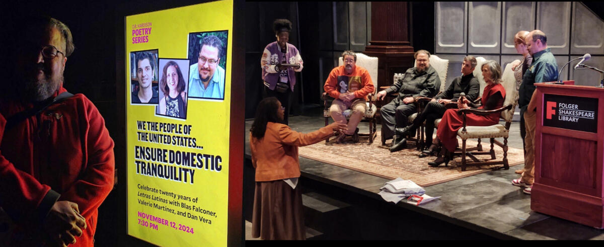 Had a wonderful time reading at the Folger Shakespeare Theater with Valerie Martinez and Blas Falconer in celebration of Letras Latinas’ 20th Anniversary and the publication of Latino Poetry: The Library of America Anthology! My thanks to Teri Cross Davis, the brilliant director of the venerable O.B. Hardison Series at the Folger and Francisco Aragon, the Director of the Letras Latinas program of the Institute of Latino Studies at the University of Notre Dame and to Sami Miranda, of the American Poetry Museum who served as moderator for the after reading conversation. So lovely to see and speak with old friends and new friends and witness the gorgeous building after so many years of closure for its renovation.